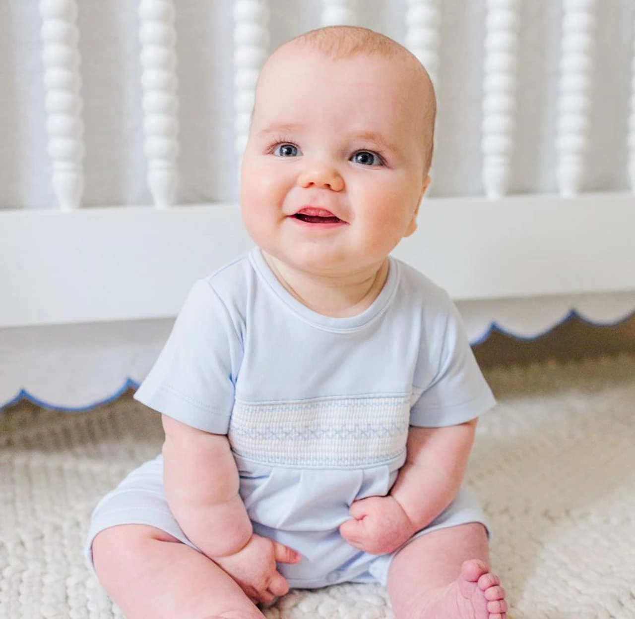 The sweetest baby boy romper you ever saw! Your little prince will capture the hearts of everyone who sees him in this dainty little outfit. With smocking, argyle embroidery, your baby boy will steal the show!