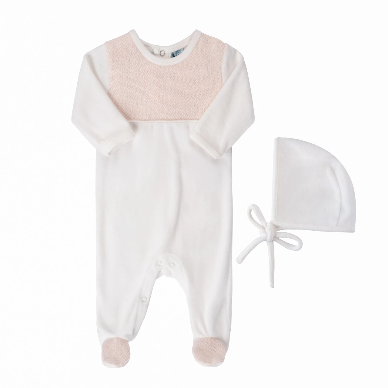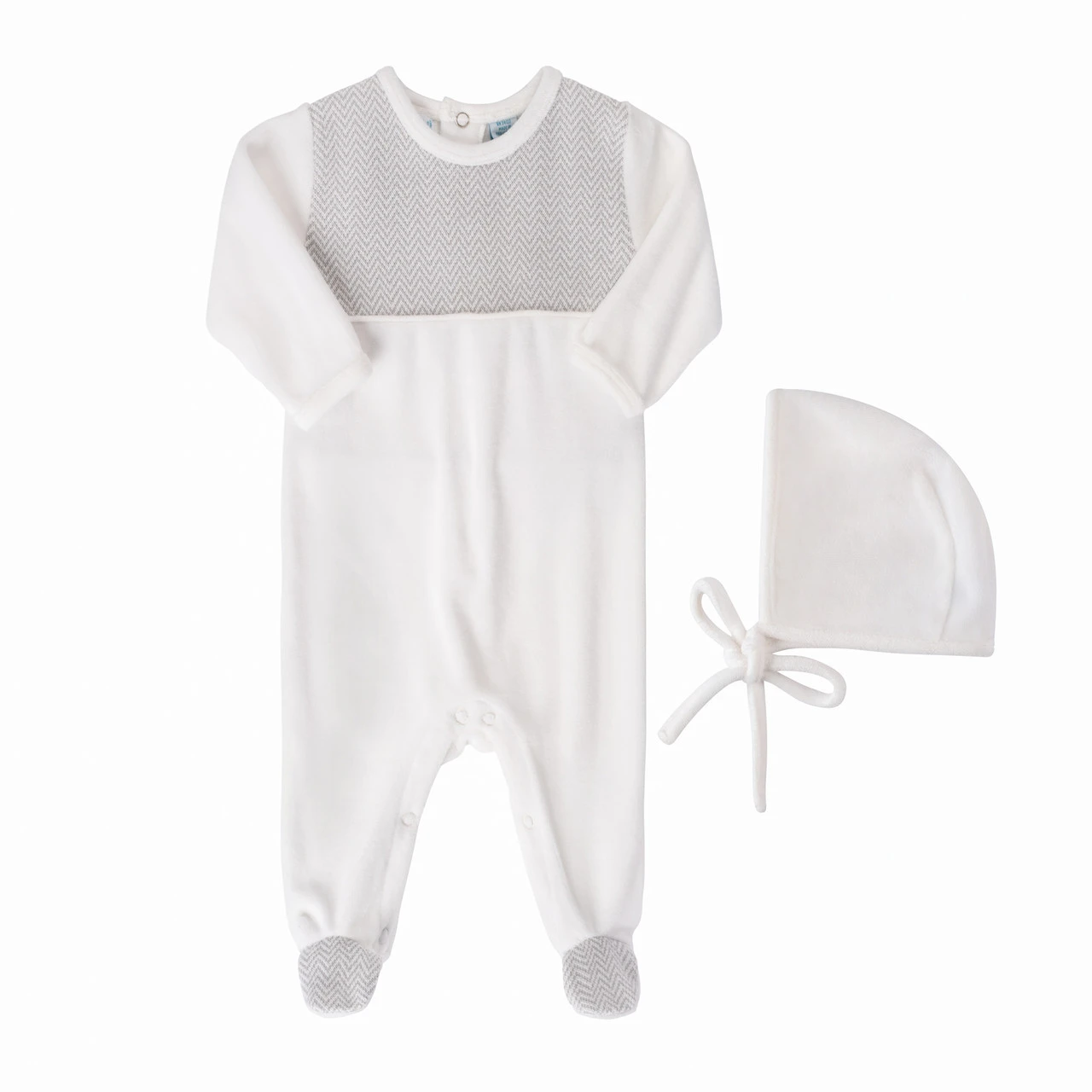 Looking for great go-to outfit for your little one this season? This velour winter romper from Feltman Brothers will keep Baby toasty warm without sacrificing on style! Comes in 3 classic colors, and includes a matching hat.