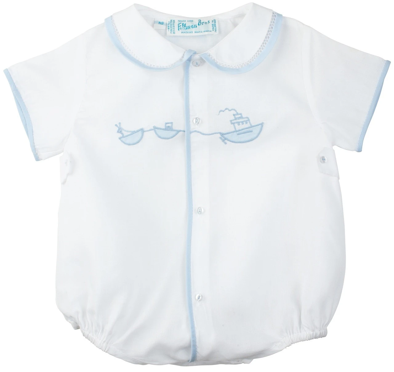 “Row, row, row your boat…” This precious little creeper will look absolutely adorable on your little prince! Features contrasting borders on the cuffs, placket, and fastened to the collar with a dainty row of fagoting. Sweet shadow stitching of a tug boat graces the center, above dainty waist tabs that add a classy look. Were you looking for an outfit for your baby boy that’s cute, classy, and unique? You’ve just met your match!
