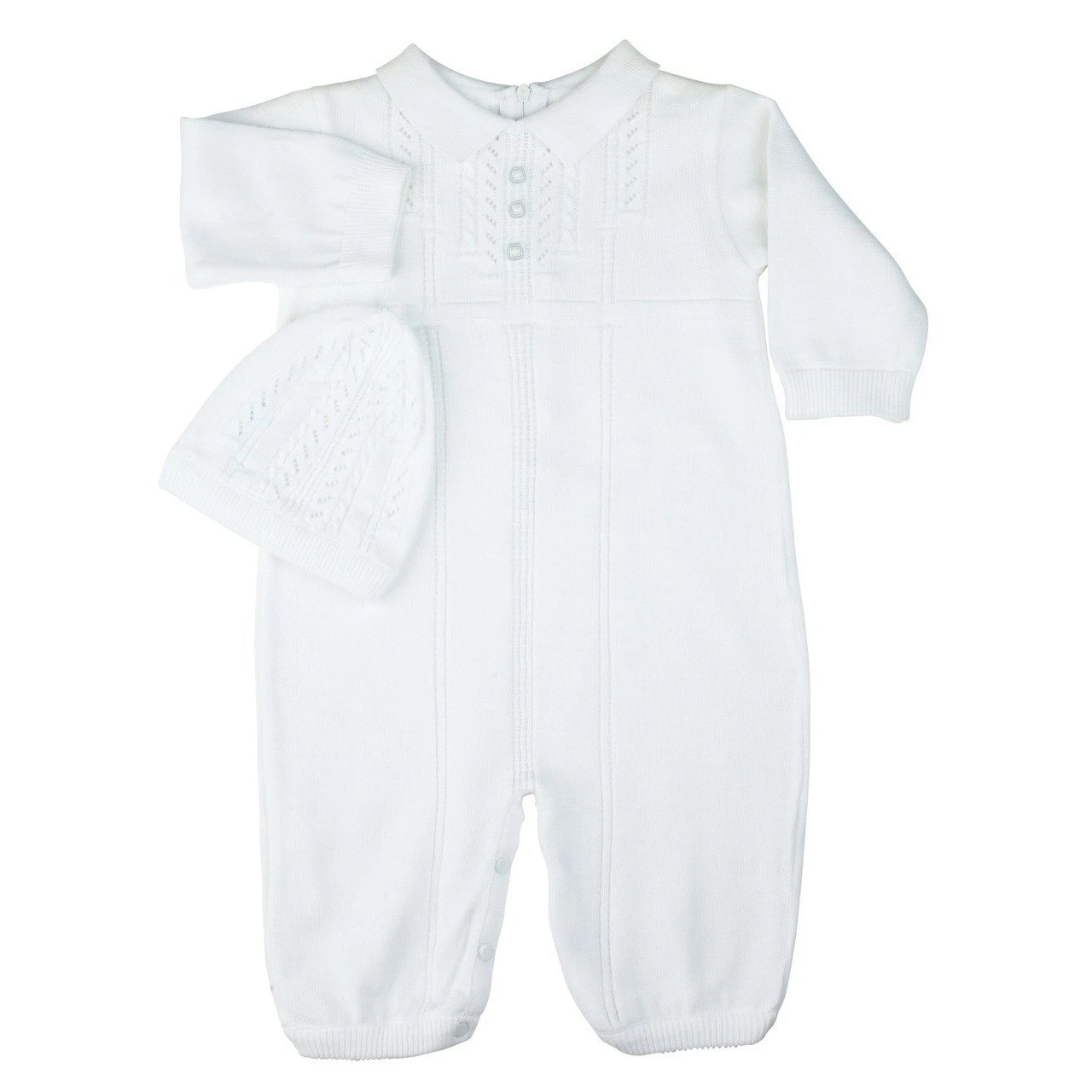 A classy knit set designed with your baby boy in mind! The Collar Knit Longall is available in soft blue or white colors, with a pointed collar and ribbed edges at the sleeve and leg cuffs. The front is embellished with cable and pointelle knit details as well as petite buttons in the center. Includes a matching hat to keep Baby warm and complete the look. A beautiful heirloom set for your prince!