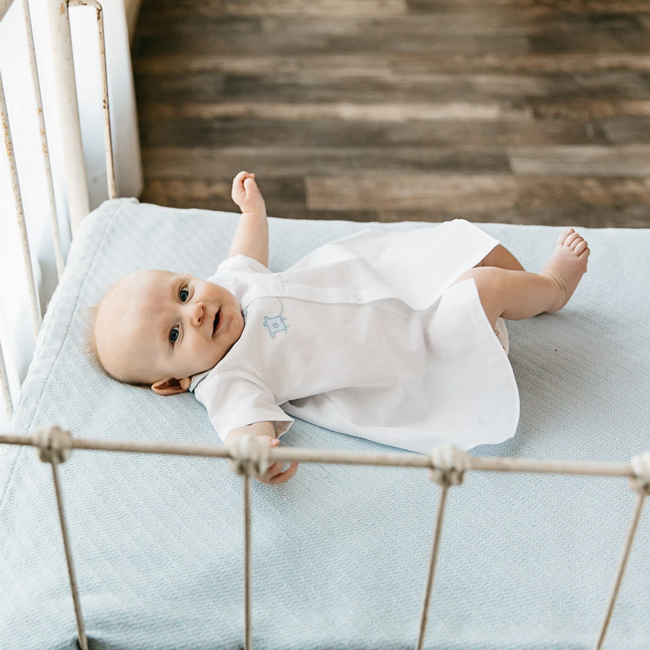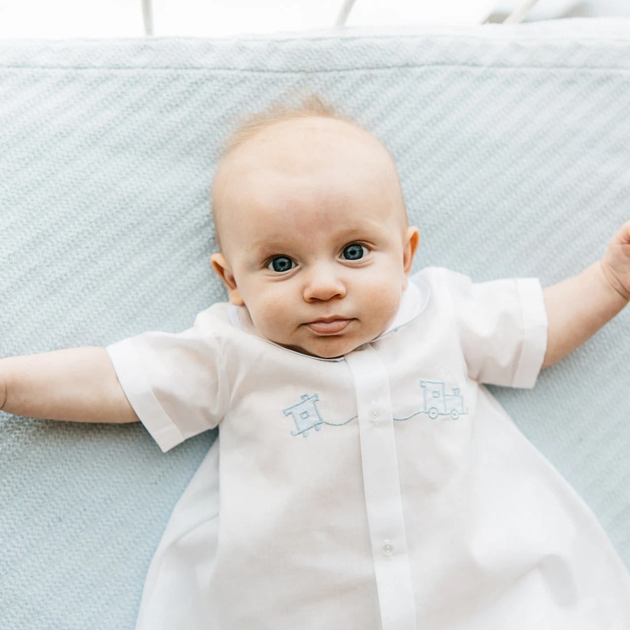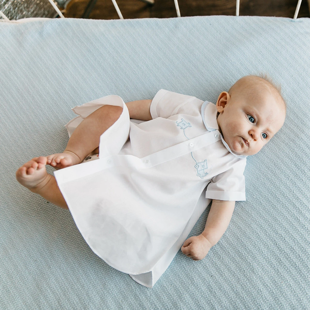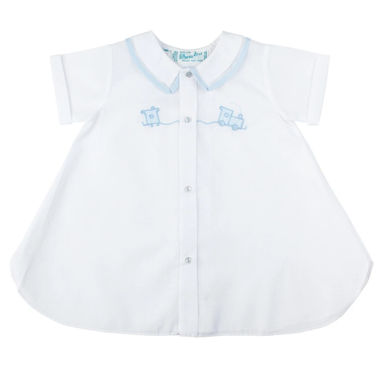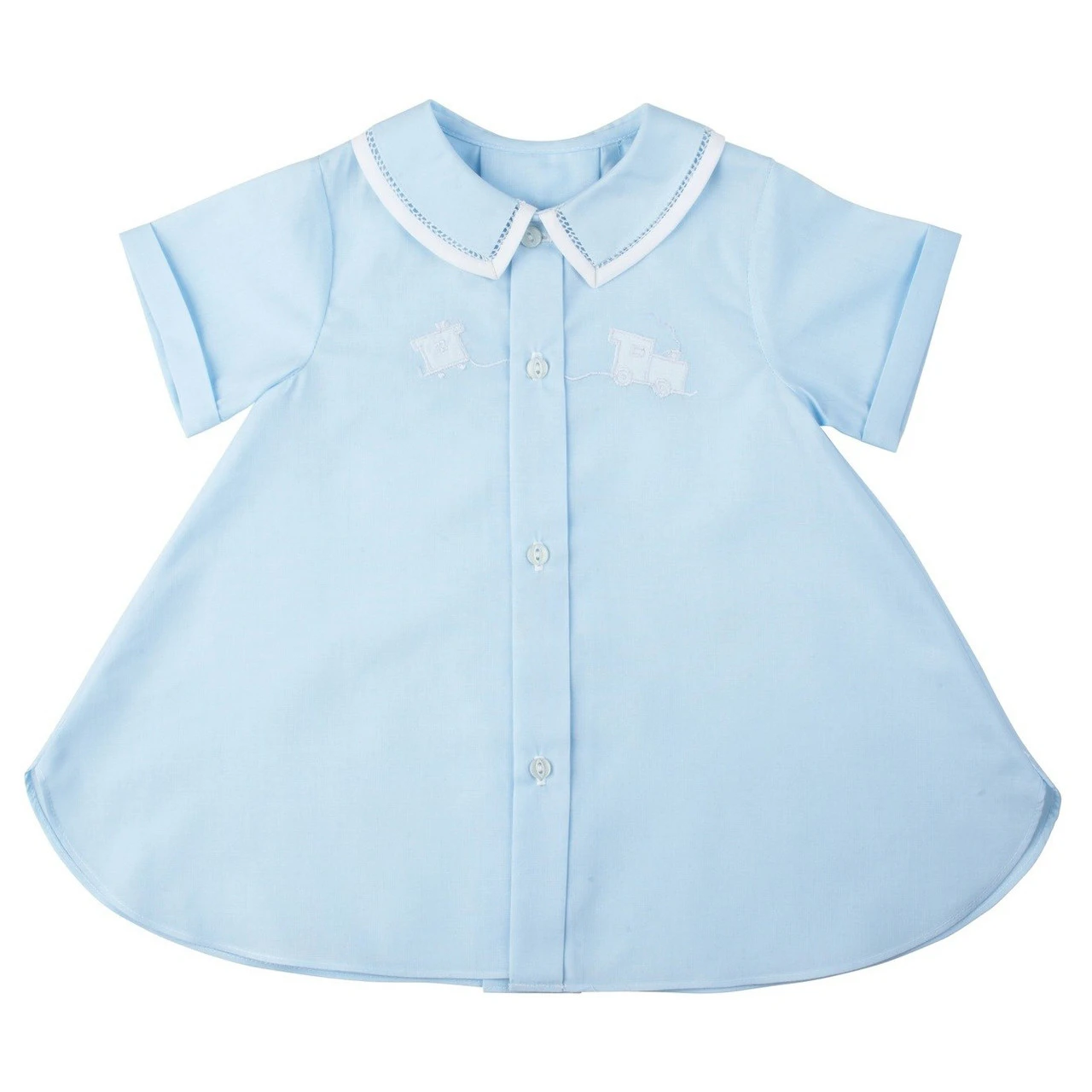 This classy day gown is just right for your baby boy! Available in baby blue and white colors, with contrasting piping along the collar attached with a thin line of fagoting. The bodice is embroidered with an adorable shadow stitch train applique going across the button down placket. This outfit is perfect for family portraits, warm days spend outdoors, and get-togethers with friends. Choo choo!