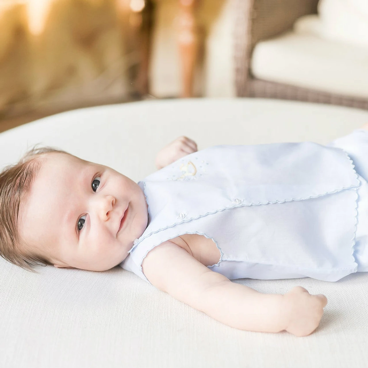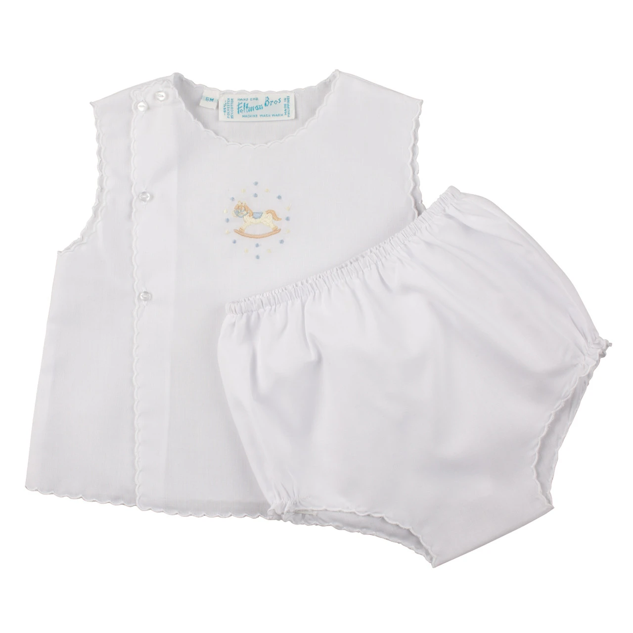 Your little one will look super cute and classy in this lovely baby boy outfit! This beautiful two piece diaper set features an embroidered rocking horse applique on the front as well as scallop shaped edges and pearl buttons for closure. Feltman Brothers Rocking Horse Diaper Set – perfect to dress him in on all those warm days!