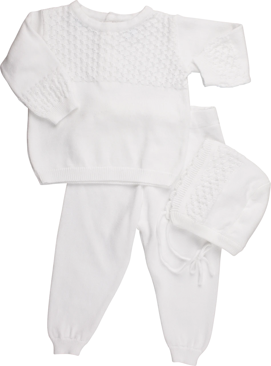 Feltman Brothers has been part of creating special occasions for generations. This two piece special occasion set for boys has been designed with your little one in mind, with its soft cotton touch and classy, vintage style. Beautiful diamond knit adorns the top and bottom of the shirt, accented with ribbed edges. Knit two pieces are a perfect choice for that big day – they’ll keep him warm and cozy without compromising on the elegant look you love. This lovely set it sure to become a treasured family keepsake for years to come!
