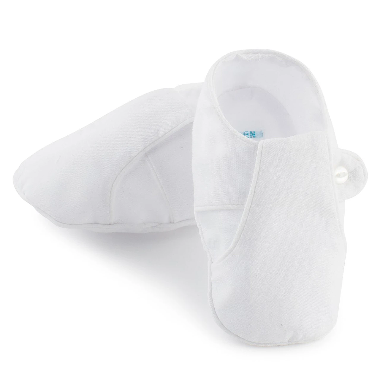 A beautiful and classy pair of baby booties for your precious little boy! These booties are the perfect match to just about anything he wears, with their refined blue and white colors and dainty style. Made with a T-strap fastened with a cute little button, these booties are both sophisticated and sweet. Just the right thing for keeping those tiny toes safe while coordinating with all his Feltman Brothers outfits. Sure to become a treasured family heirloom for generations!