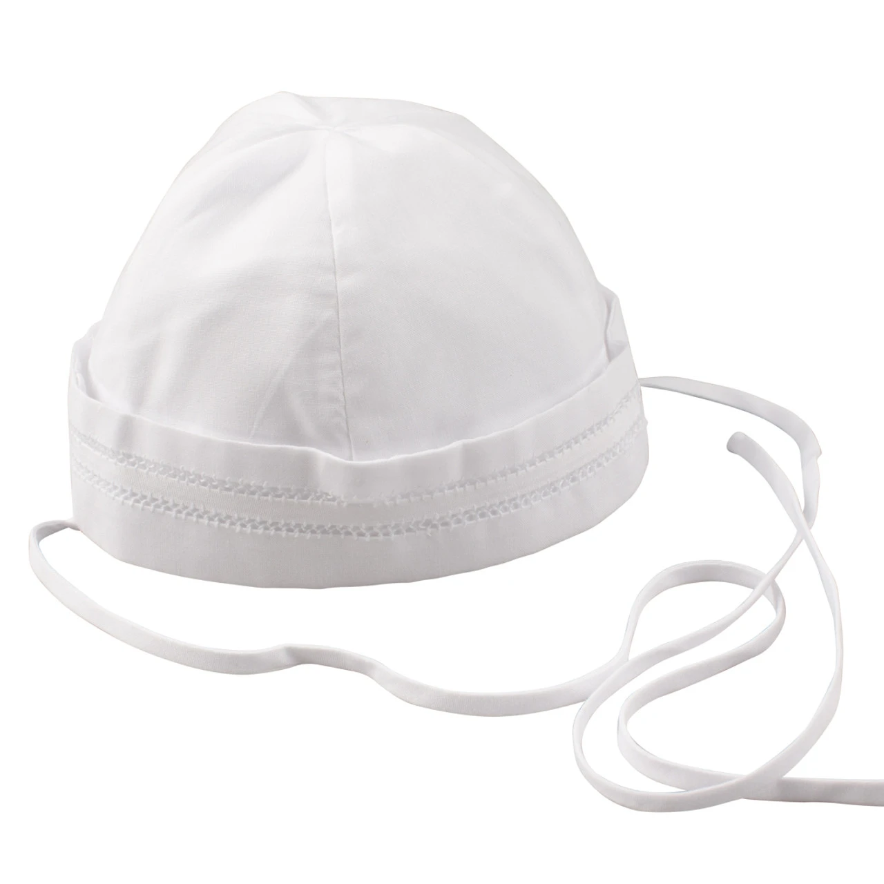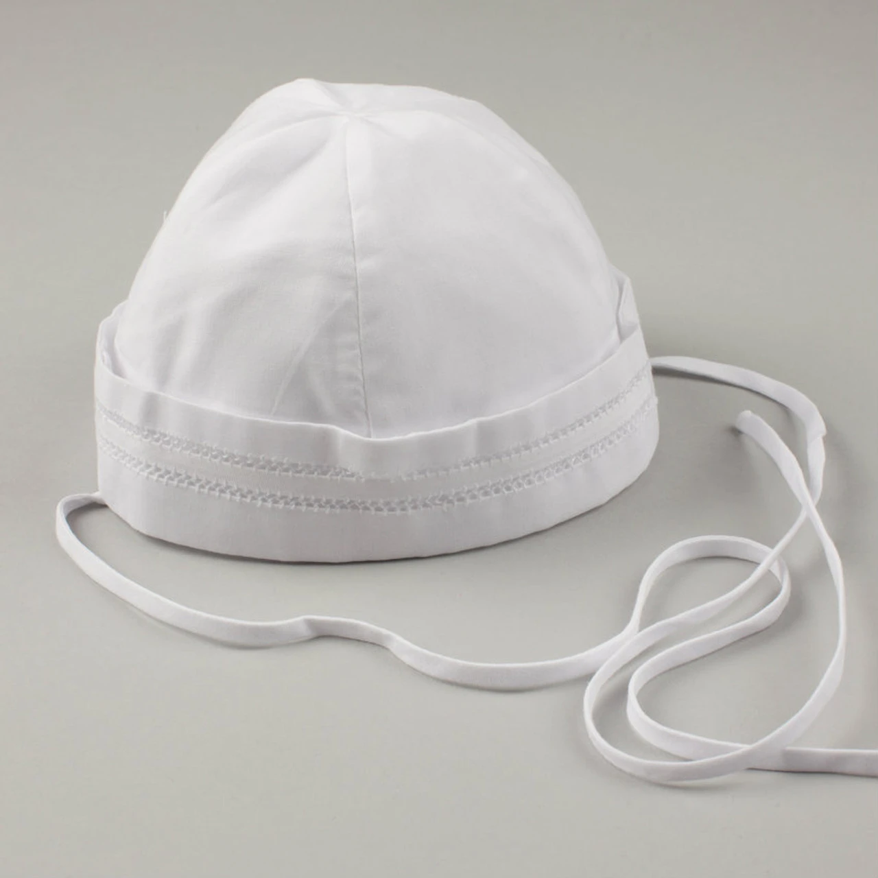 Who doesn’t love a little sailor boy? In this adorable sailor hat your little one will be ready to ride the waves! Made of solid white with fagoting along the brim and thin ribbons for fastening securely beneath his chin. Match to one of our many sailor and nautical themed outfits, and he’s off to conquer the seas! PLEASE NOTE: This hat does run small. It is recommended to purchase a size up.