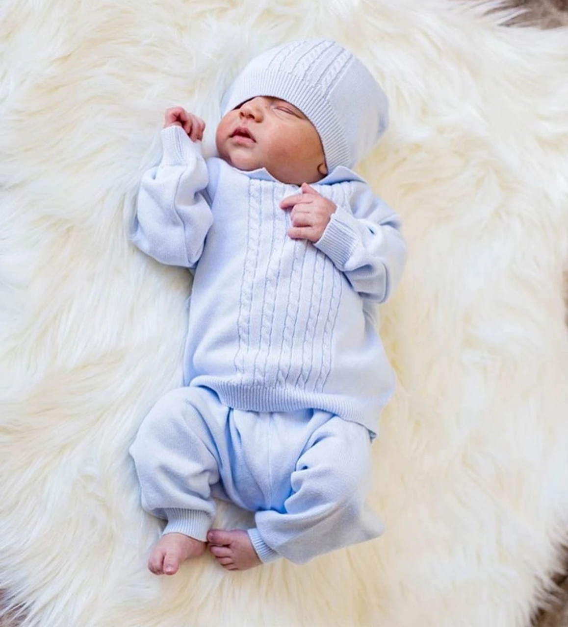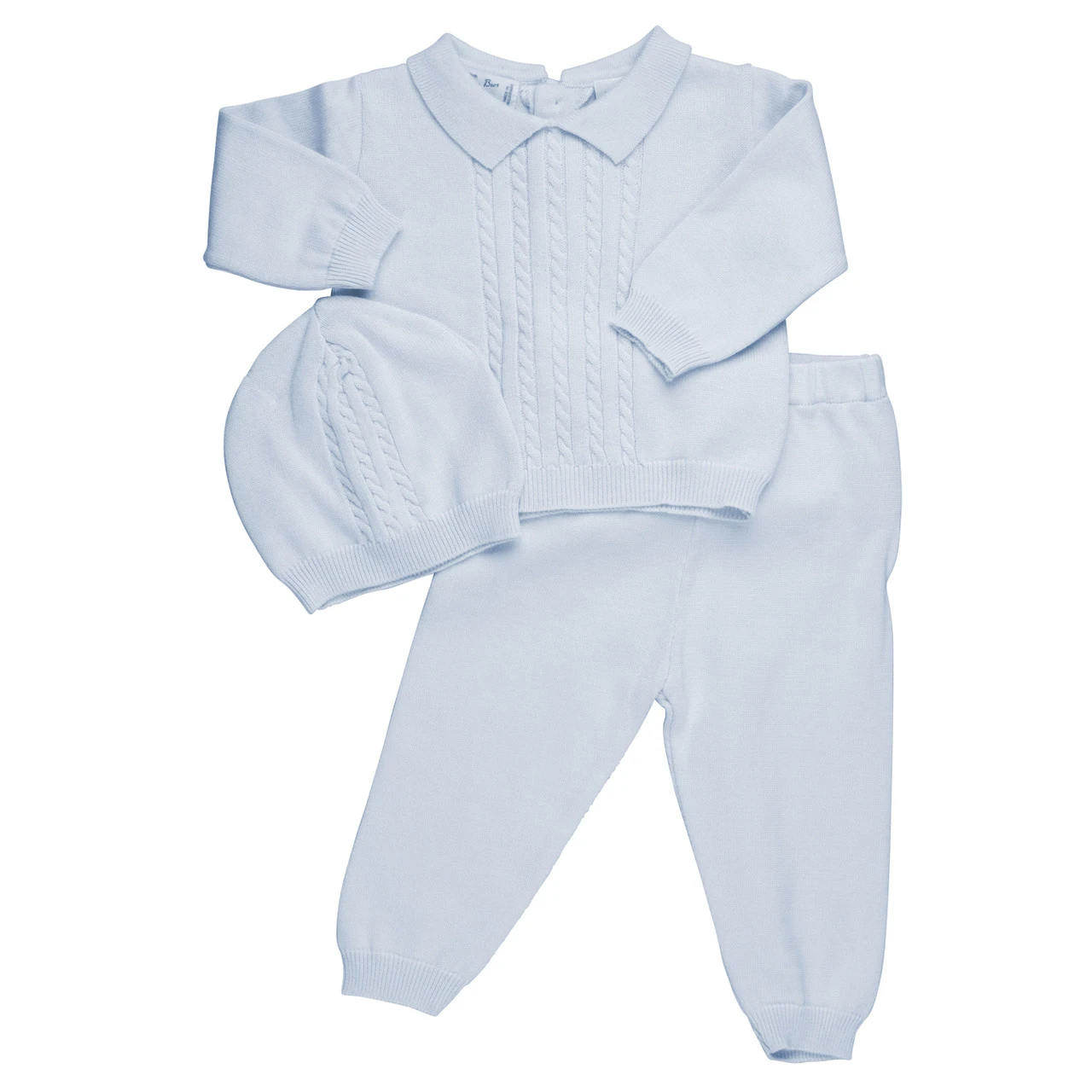 A must-have for every baby boy’s wardrobe! This classy set is warm and cozy with its soft knit cotton, available in blue, white, and grey. Features classy cable knit down the center, as well as a sharp pointed collar and ribbed cuffs. Includes a coordinating hat with a matching cable design for keeping that little head warm and finishing off the look. Who can resist such a cute knit set?