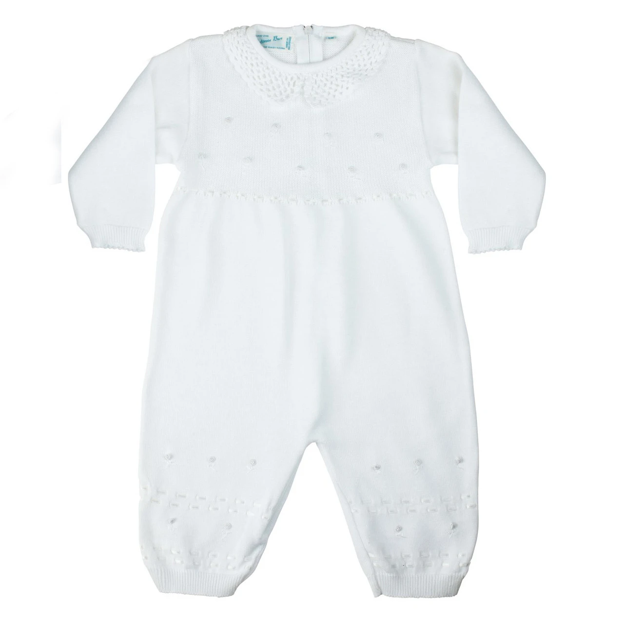 Ribbons and rosebuds, what more can a little girl dream of? This is definitely the knit baby girl romper of those sweet dreams. The crocheted peter pan collar is so beautiful, plus it has fine hand embroidered rosebuds scattered on the yolk and towards the bottom of the romper combined with the woven ribbon design. It’s a real beauty. You will enjoy this classic baby girl romper at every special occasion.