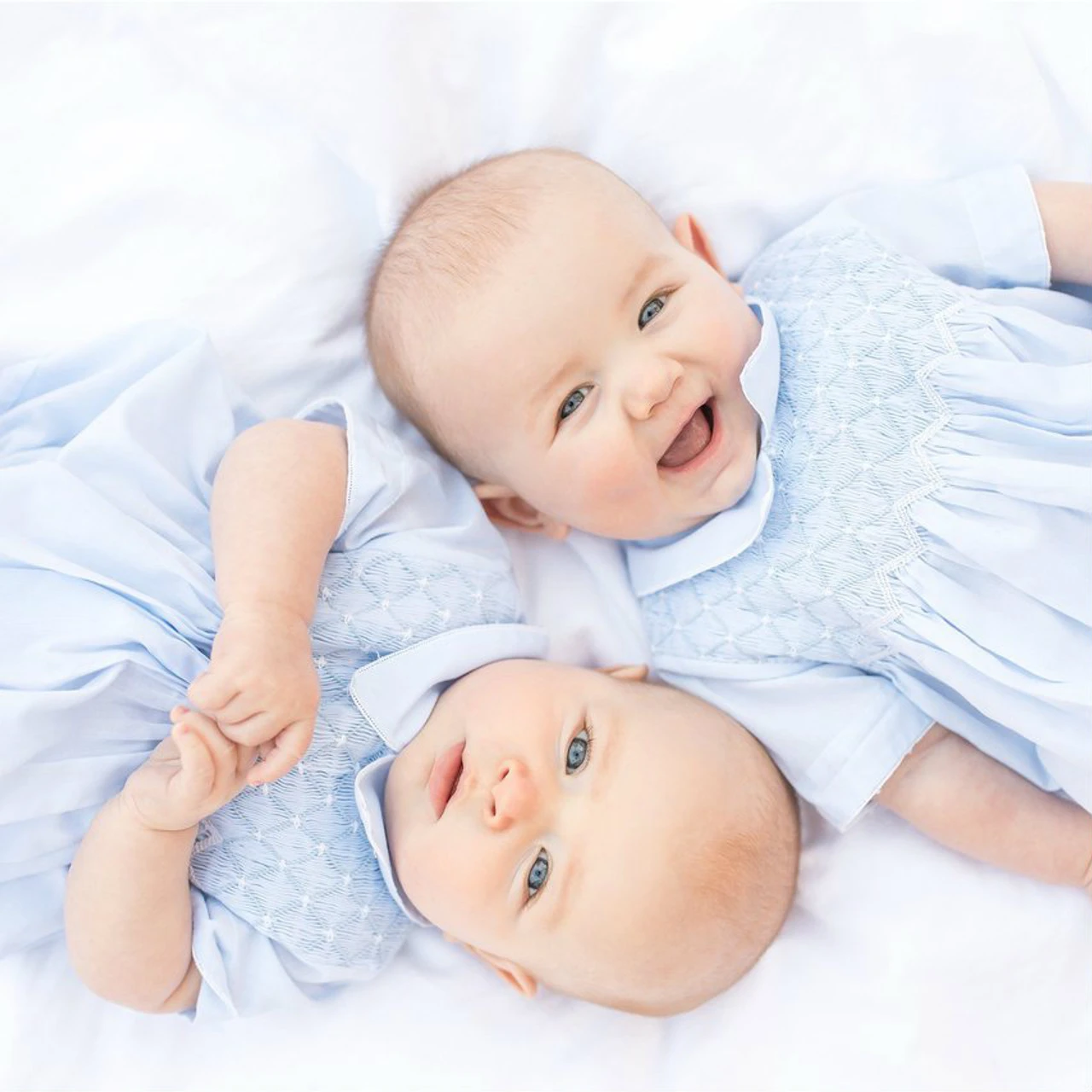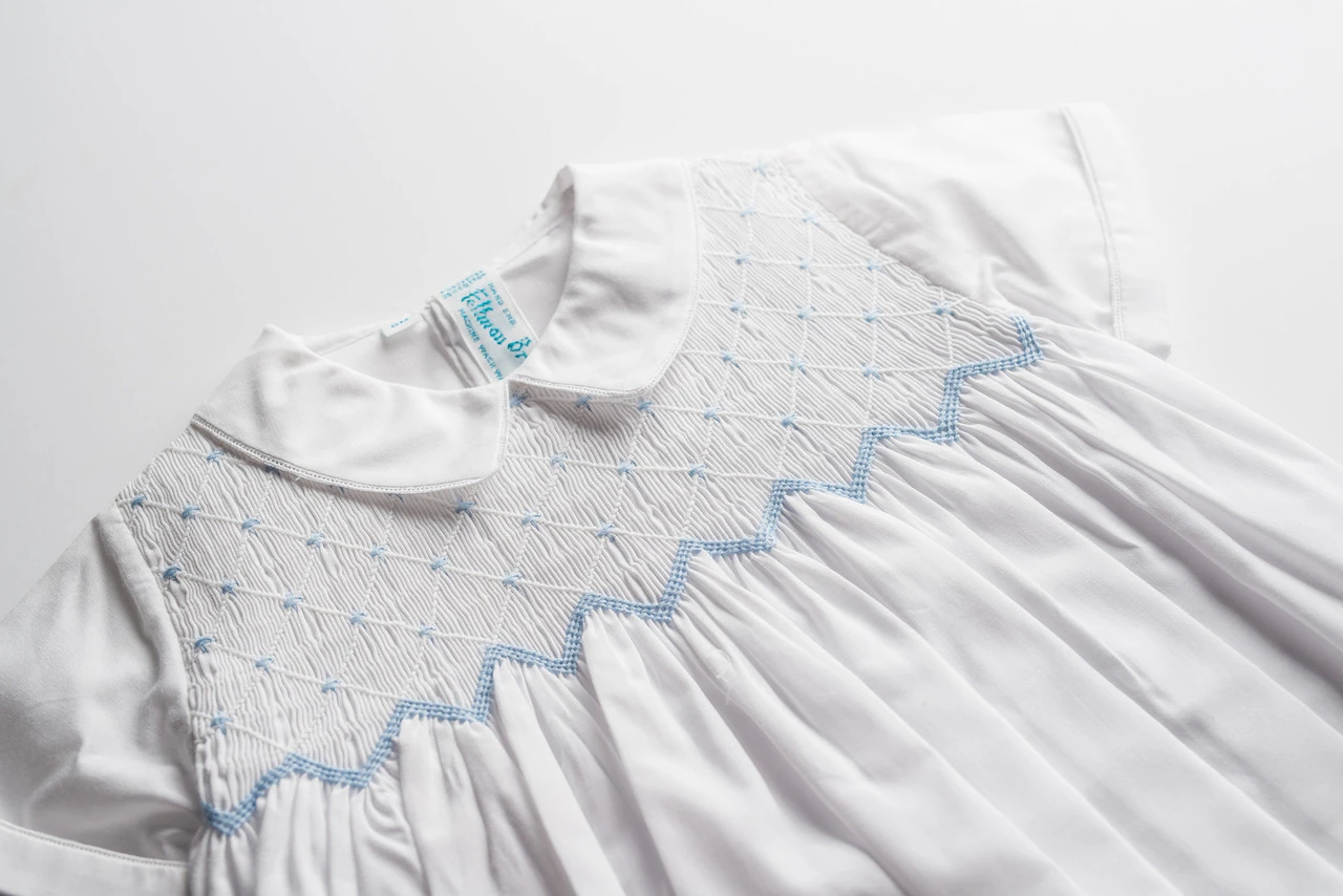 Looking for a beautiful, classy creeper for your baby boy? Check out the Diamond Smocked Creeper, with it’s lovely, understated style, sure to please the discerning eye. Available in soft white and baby blue, with contrasting colored embroidery on the smocked bodice – a diamond overlay with a chevron border along the bottom. Beautiful lace beading trims the collar and cuffs for an added touch of class. Perfect for family get-togethers, outings with friends, and any time you need that classy, vintage look!
