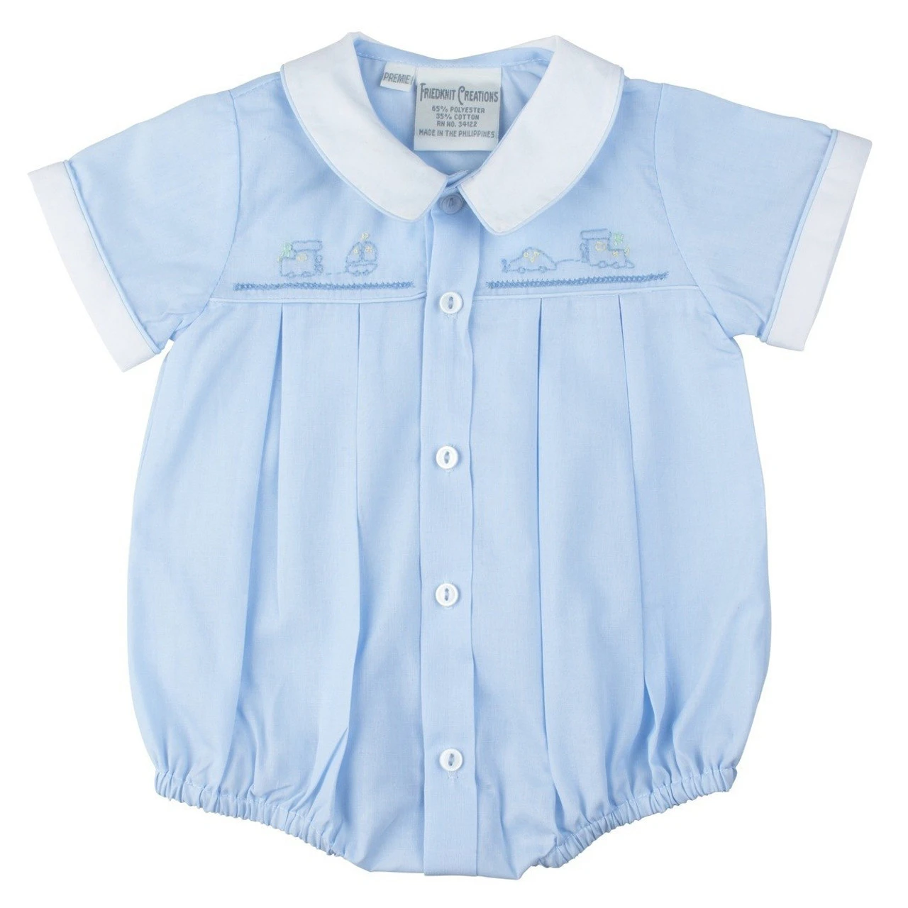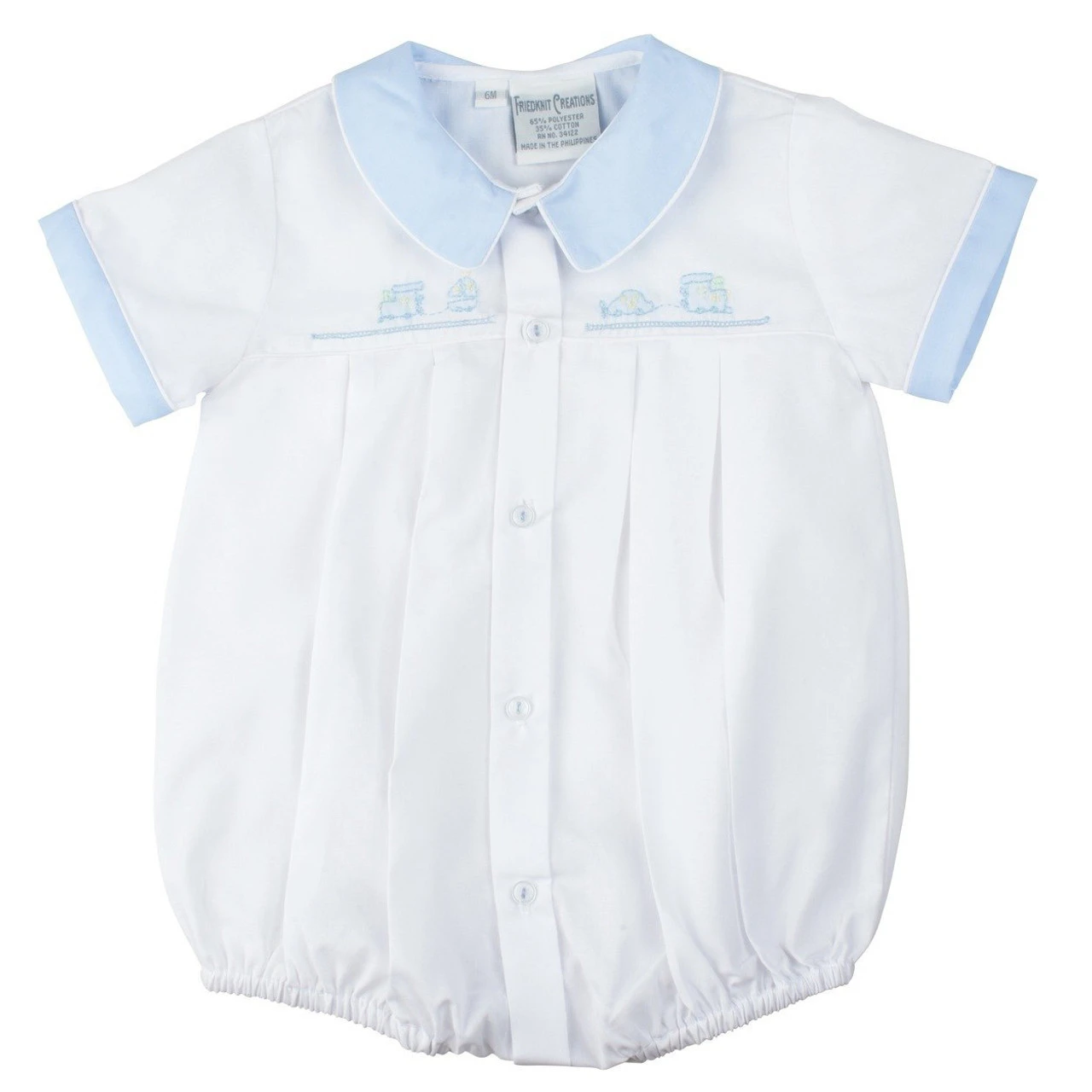 Nothing says “detailed” more than a hand embroidered creeper! This beautiful and intricate preemie creeper is both cute and classy – perfect for you precious baby boy. The creeper comes in blue and white, featuring contrast colors on the collar and sleeves cuffs with piping along the edges for an added touch. The highlight of this piece is the hand embroidered design on the bodice – a sweet little train made out of shadow stitch embroidery with a tiny row of boring below it. The bodice ends with a bit of piping and then goes into sharp pleats down the remainder of the piece. Intricate embroidery and dainty details – this is definitely the piece you were looking for. Choo choo!