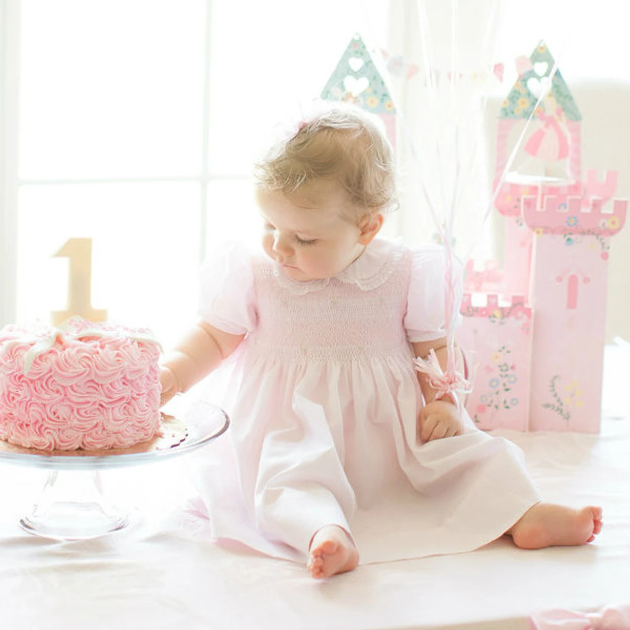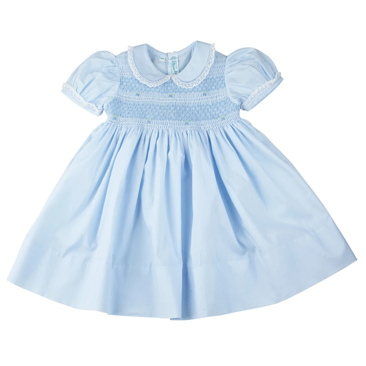 A beautiful smocked dress, unlike any other! This dainty little girls dress is a true classic with its embroidered smocked bodice, delicate fagoting, and fluted lace trim. Available in pink, white, and blue with a sweet peter pan collar and short puffed sleeves, edged with dainty fagoting and a fluted French lace trim. A classy smocked bodice features intricate hand made embroidery including a diamond overlay, soft white lines, and darling floral bullions. Ties in the back with a big classy bow for an elegant finish. The perfect dress for Easter, formal events, or everyday layette. The Feltman Brothers Lacy Smocked Dress – set to become a treasured family heirloom for generations!