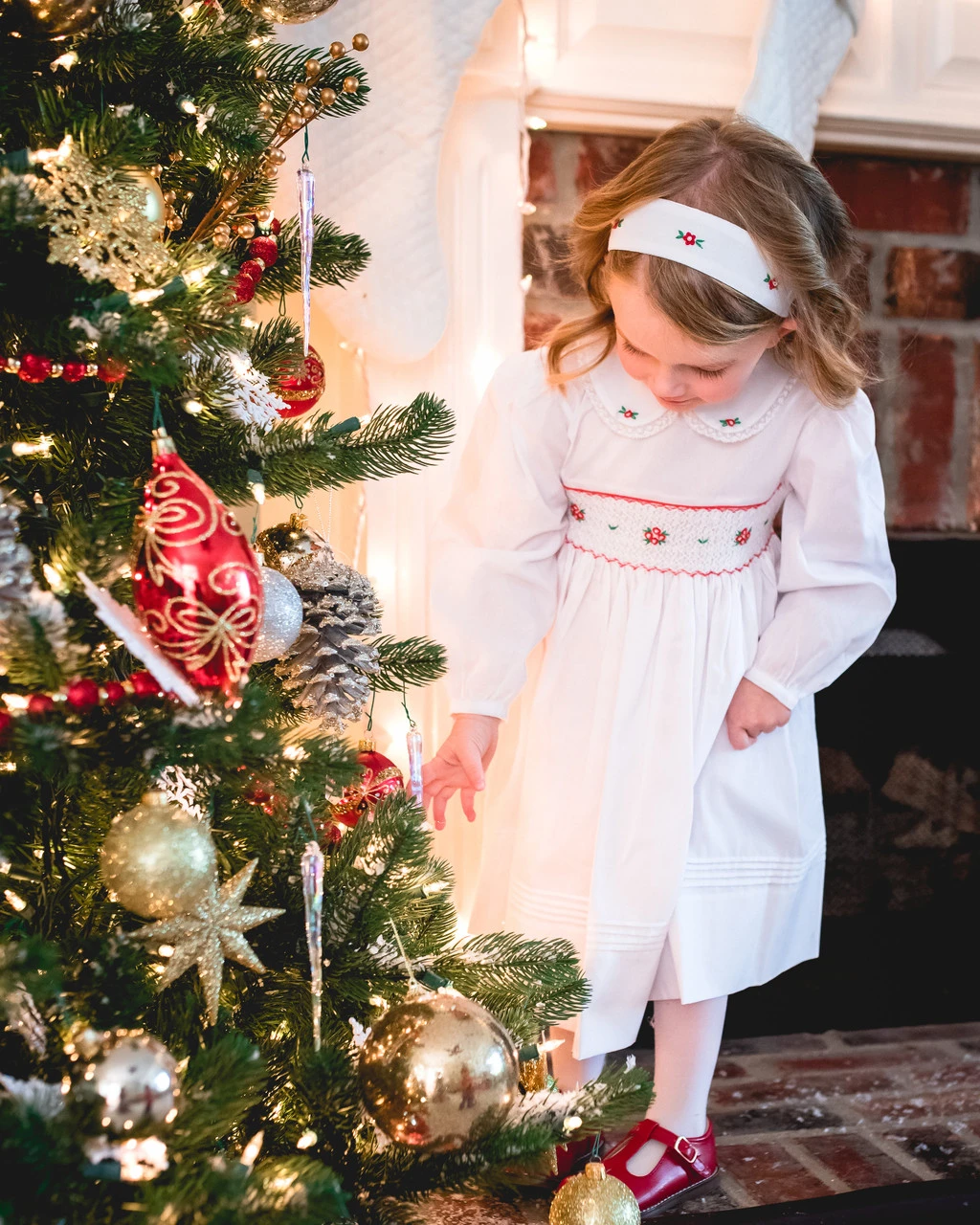 There is something so endearing about a little girl in a dainty headband. This pretty white holiday headband features hand made flower bullions with pearls in the center, and is a beautiful accessory for so many Feltman Brothers holiday outfits. Sweet little girls in sweet little headbands – how much cuter can you get?