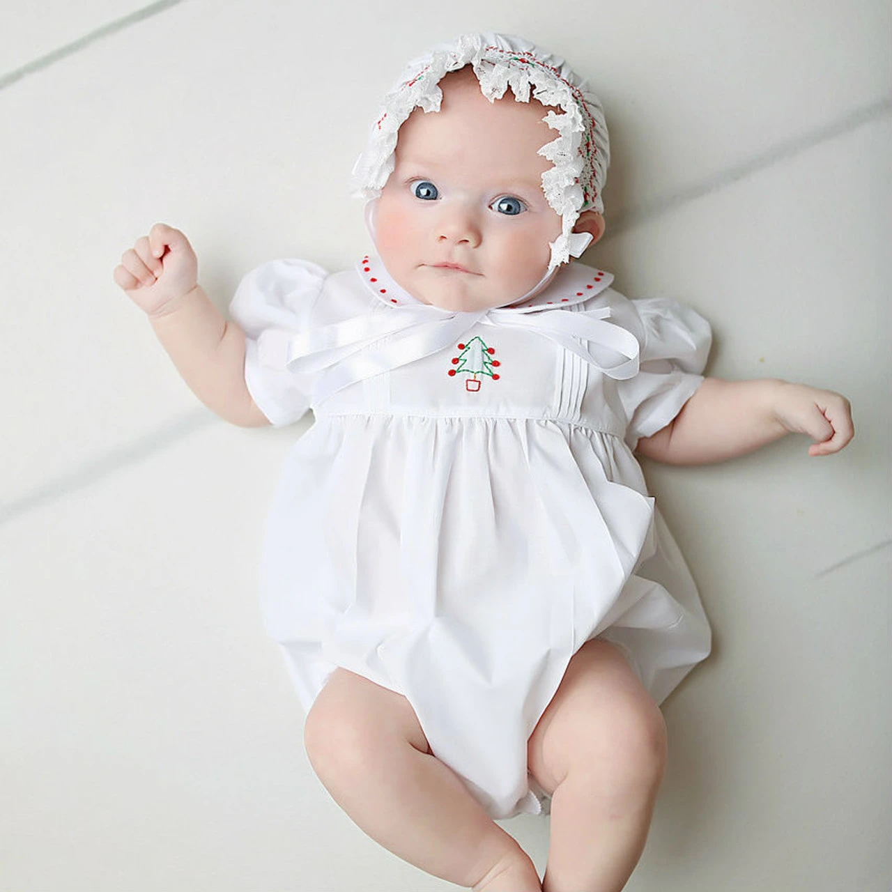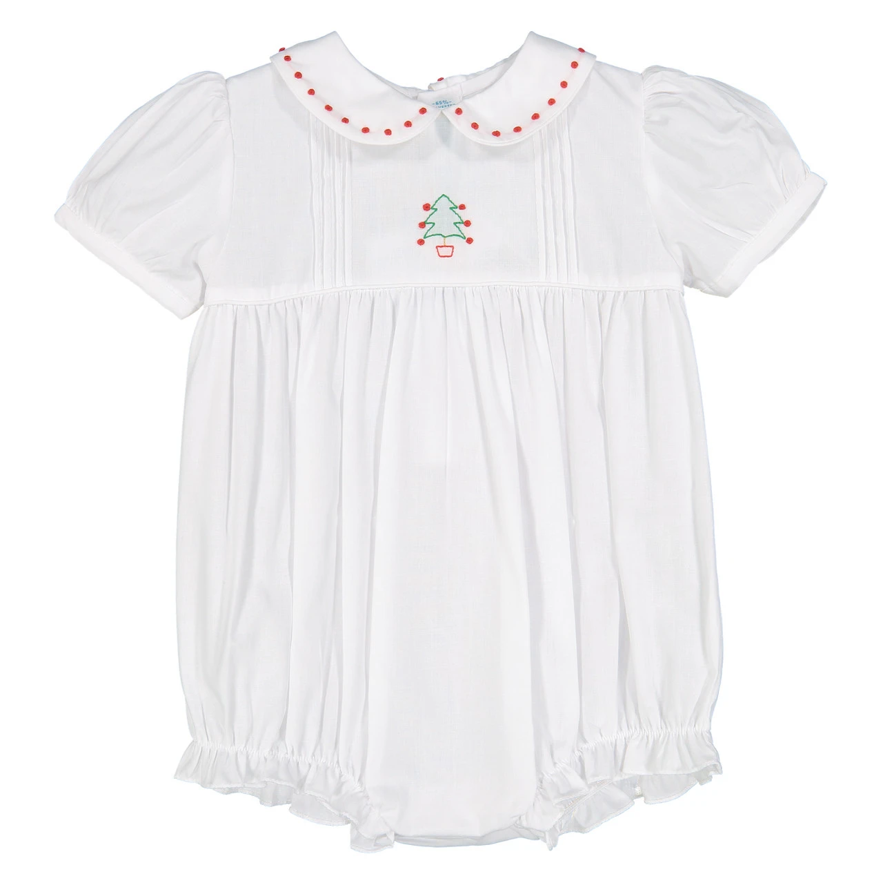 It can be hard to find a baby holiday outfit that is just right – classy, cute, and of course comfortable. We at Feltman Brothers know that, which is why we create our entire holiday line with your child in mind! This baby girl holiday bubble is just the thing you were looking for, with its classic design and beautiful holiday themed details. Red French knots accent the peter pan collar just above the pintucked bodice. And don’t forget the dainty holiday tree embroidery in the center – a hand made shadow stitch design that is classy with timeless quality. Try our Holiday Tree Bubble, sure to became a family heirloom for years to come!