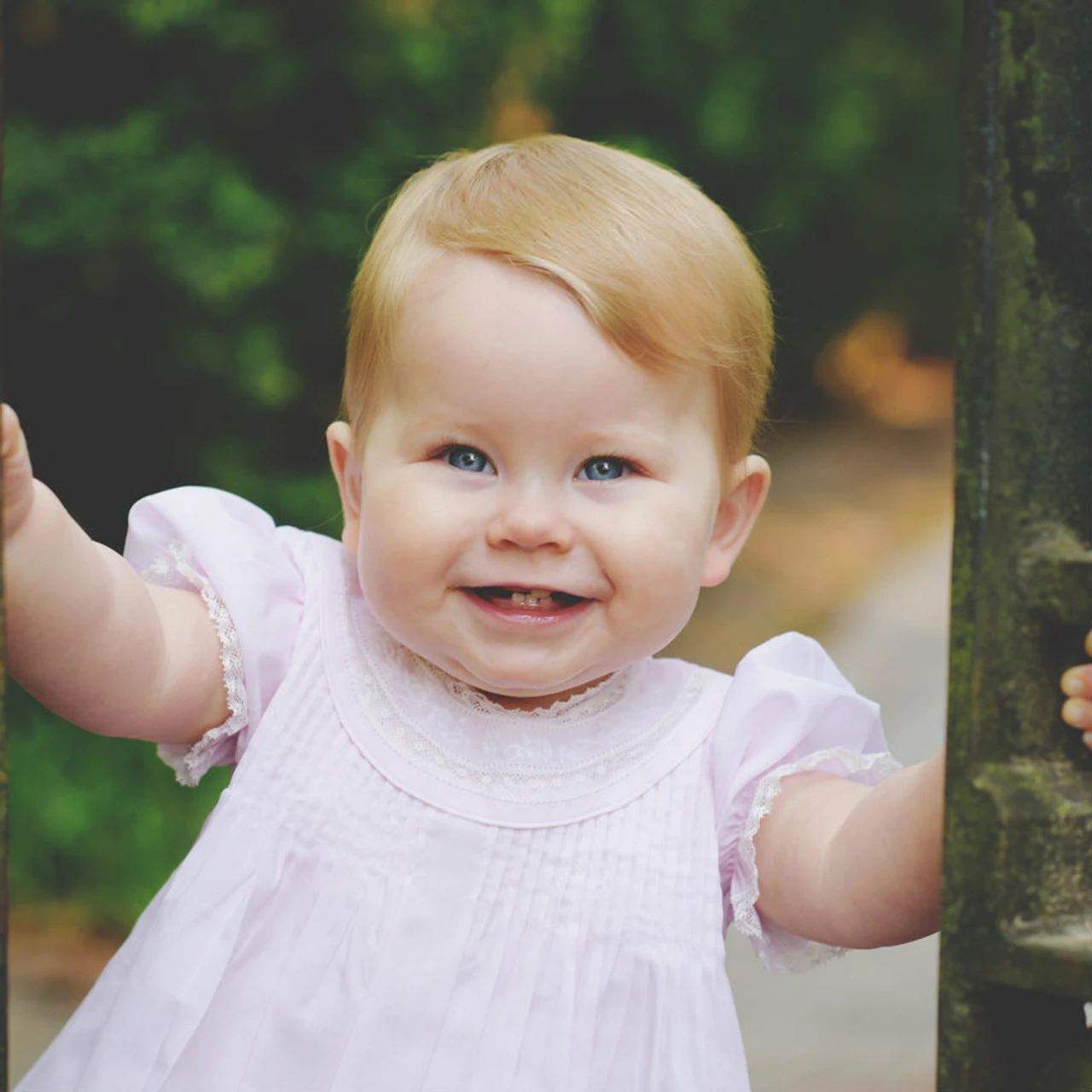 Pretty and precious – just like your little princess! The Lace Trim Embroidered Slip Dress is a masterpiece of detail, full of lace, embroidery, and hand made pintucks. Delicate fluted lace lines the neck, hem, and puffed sleeves of this dress. The rounded neck displays a beautiful floral embroidery with a lovely lace inlay just beneath it. Below that, the bodice goes into tiny hand stitched pintuck on both sides of one central pleat going down the front. At the bottom of the dress is more beautiful embroidery followed by a lace inlay in a wide scalloped shape. The slip dress beneath also features scalloped lace hemming with a bit of embroidery on top, as well as sweet white edged scalloped neck and arms. In this beauty, your little girl will look like the sweet baby she is!