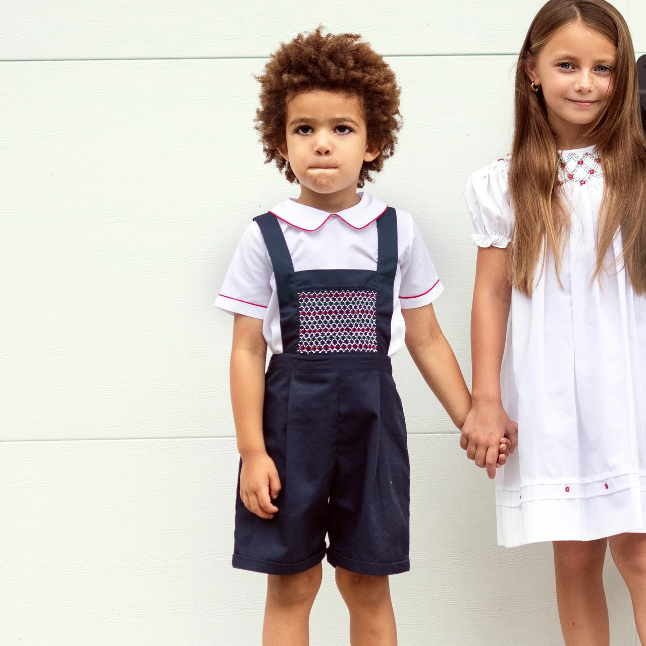 - 2-piece set includes a starched white shirt with holiday-red piping along the edges, and navy blue overalls.