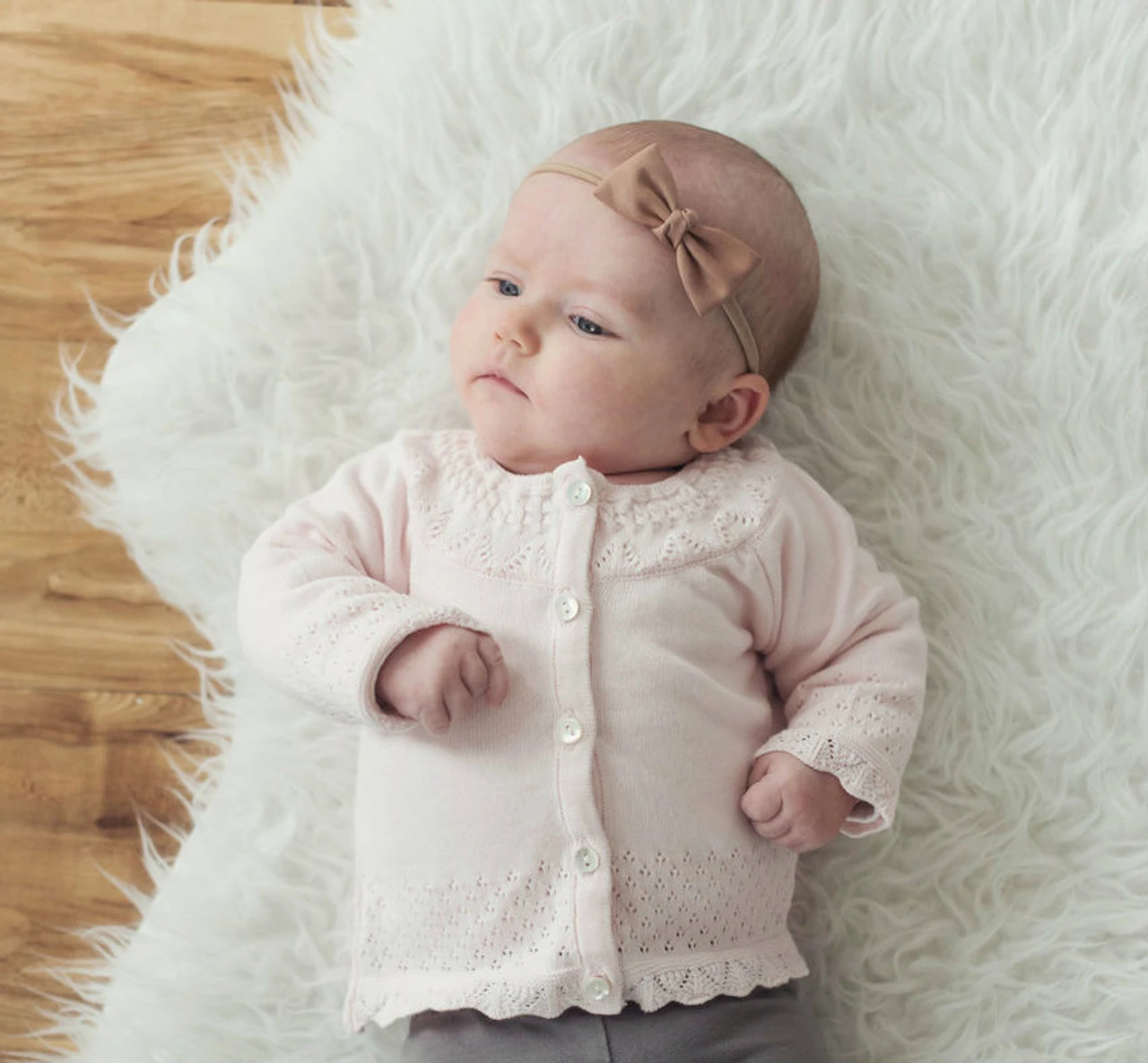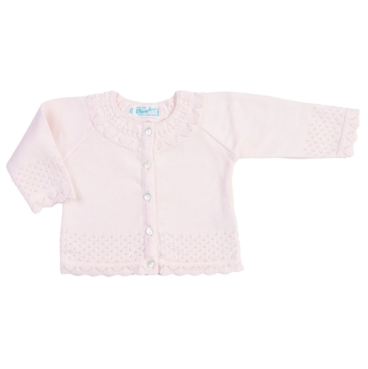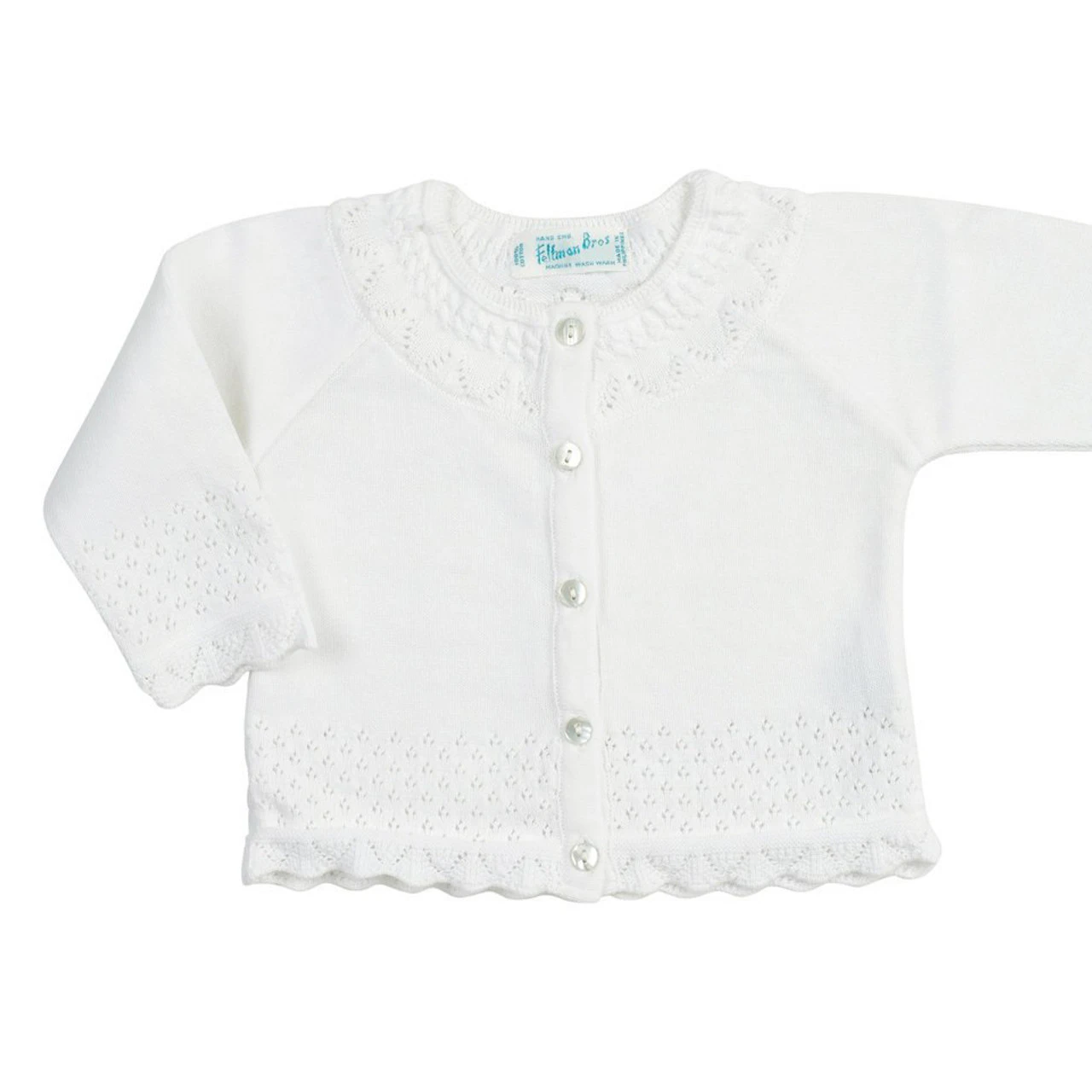 Cozy and oh so cute! Check out this adorable pointelle knit cardigan from Feltman Brothers – the perfect cardigan for your little girl! This classy and charming piece works great for layering or as a beautiful top of its own. Intricate pointelle stitching decorates the neck, sleeves, and bottom of this cardigan. Sweet looking ruffles line the cuffs and end, adding a precious girly look. Opens with mother of pearl buttons down the front for easy on – easy off convenience. Choose Feltman Brothers cardigans, sure to please every time!