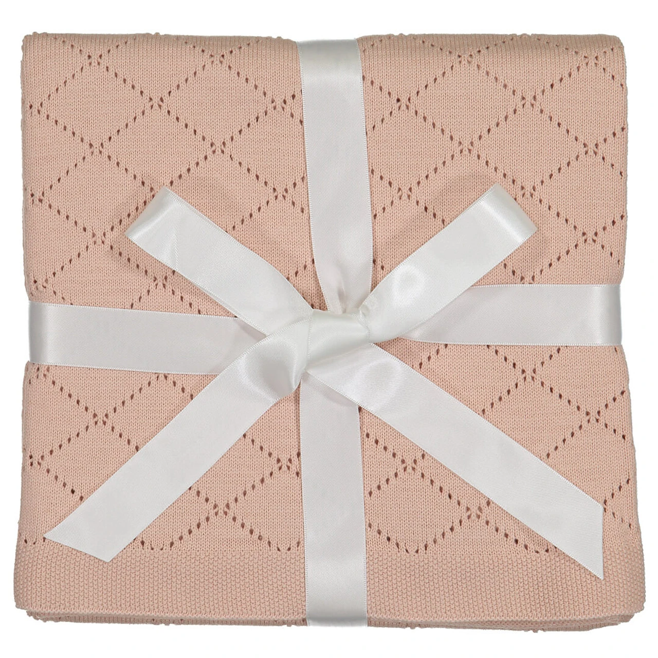 This knit baby blanket from Feltman Brothers is oh so sweet! It is made out of soft knit material with a classy diamond pointelle design throughout the weave and seed knit edges. Available in white, blue, pink, and our popular sea coral to match any outfit your loved one is wearing. Perfect for a baby bassinet, carriage, or swaddling your precious bundle of joy.