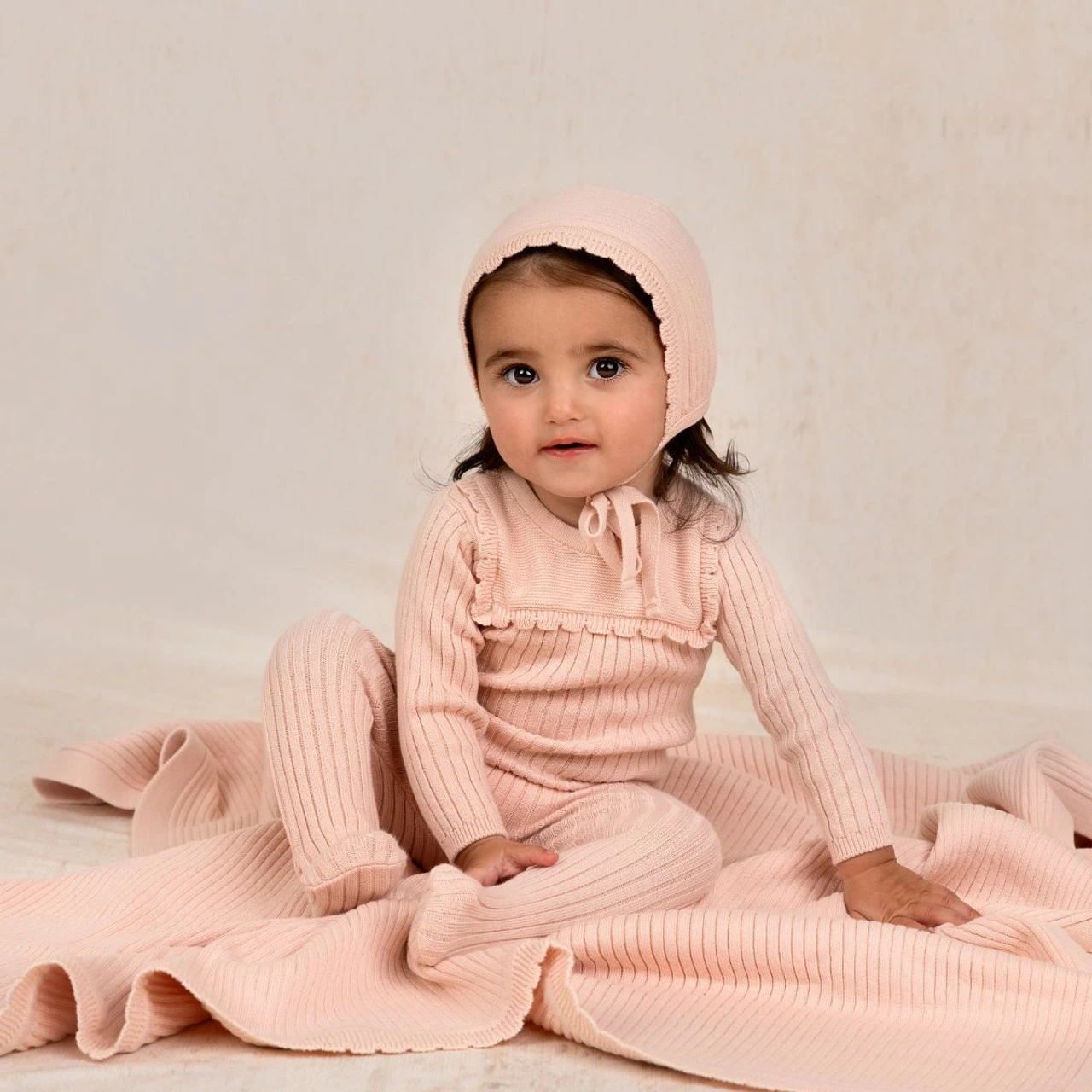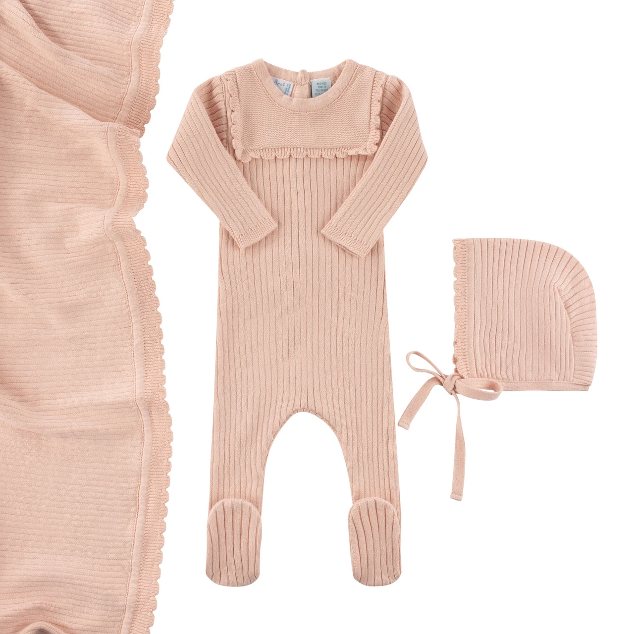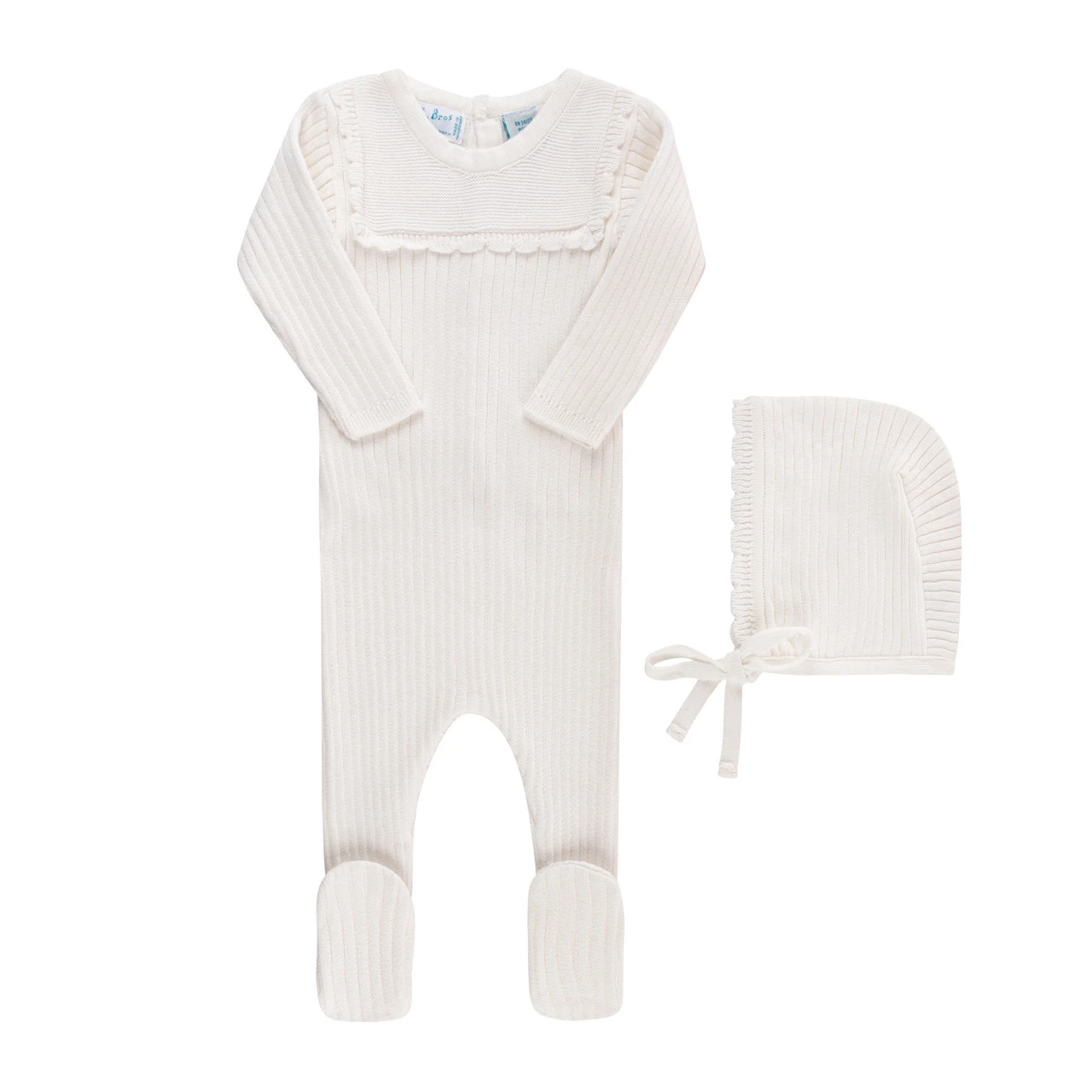 Meet a timeless knit baby romper, made of the softest, warmest cotton, with a matching bonnet included! Romper and bonnet are both made of classic ribbed knit with the sweetest scalloped trim. Matching knit baby blanket available as well, for a complete layette set!