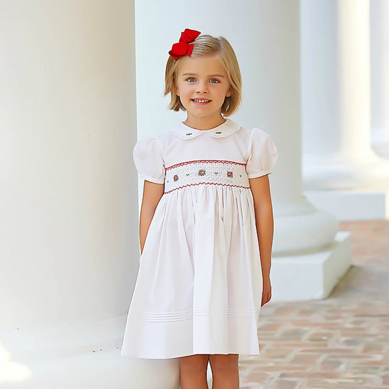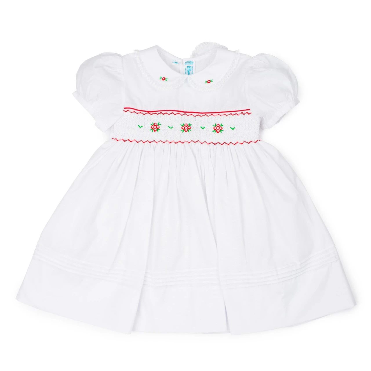 Priceless memories are made in Feltman Brothers dresses! This sweet holiday dress is just right for your little girl this season, with its intricate hand made embroidery in the traditional holiday colors. The rounded collar features a fluted lace trim and dainty hand embroidered flower bullions. The smocked bodice as well features beautiful embroidered designs, giving the dress its classy, detailed look. Horizontal pintucks lie just above the hem, finishing off the dress with a touch of class. The holidays are time for family, friends, and love – and the perfect time to show off your little princess’s beauty! (Panty included in sizes 3M-9M)