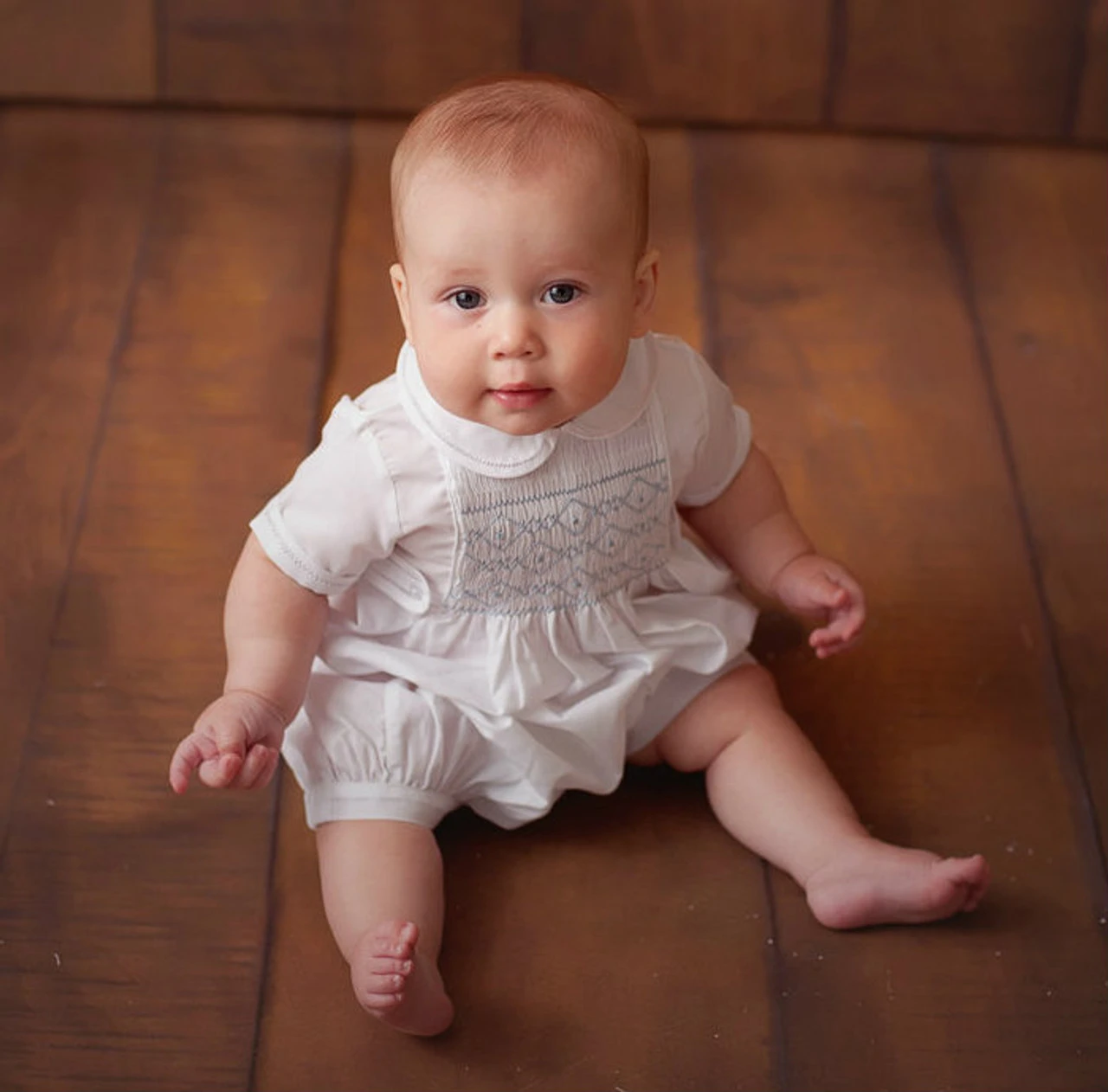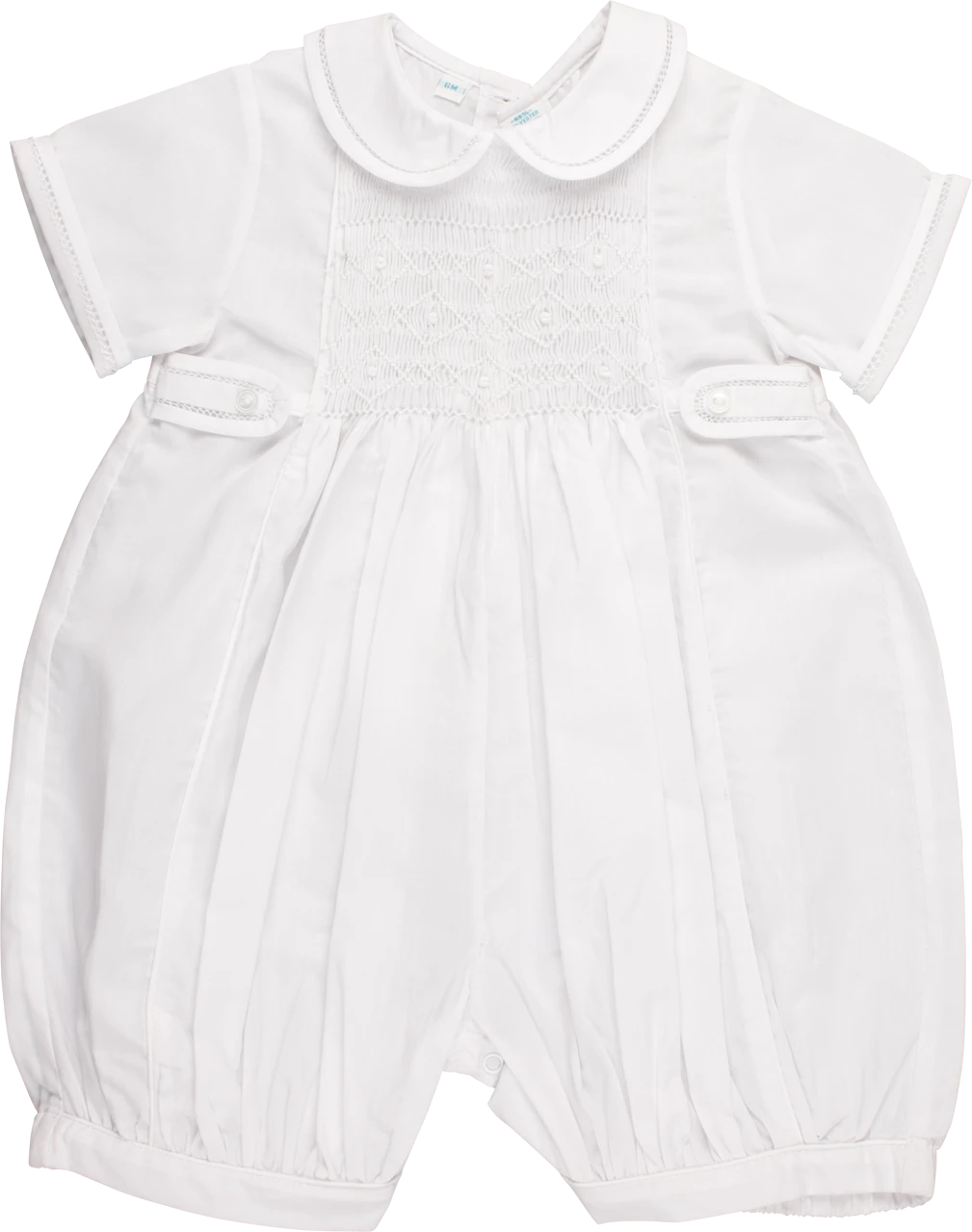 A classy, vintage style shortall for your little prince. This elegant outfit is just right for your little boy, with its soft white color and beautiful details. The shortall features delicate fagoting along its peter pan collar, sleeve cuffs, and tiny waist tabs, as well as a smocked bodice covered in lovely diamond hand embroidery, (available in either white or blue.) Perfect for special occasions, when you really want your loved one to steal the show!