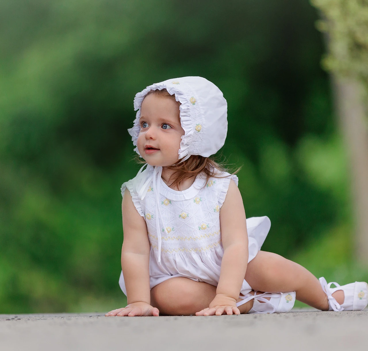 Love the Daisy Romper or Dress, and want to complete the look? Pair with this adorable bonnet, made with the same hand-embroidered daisy bullions and smocking and you’ve got the complete look!