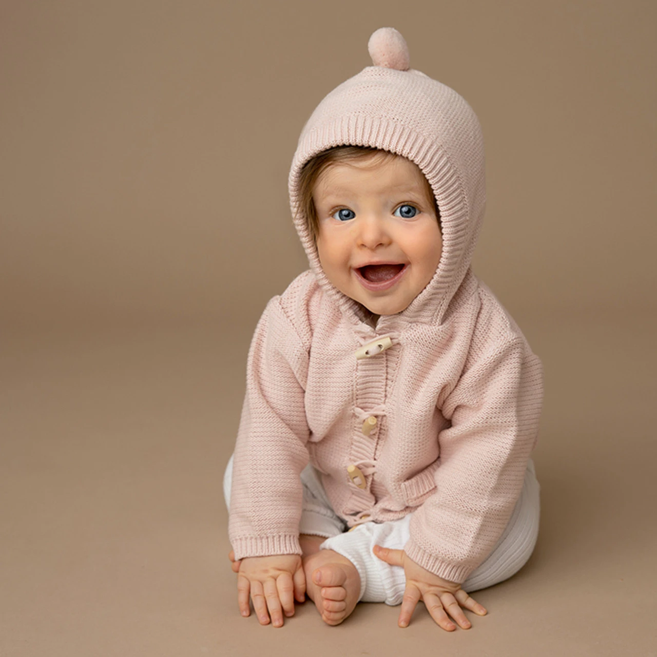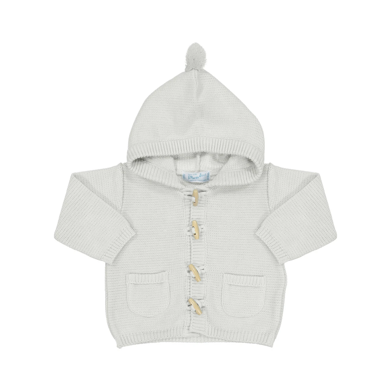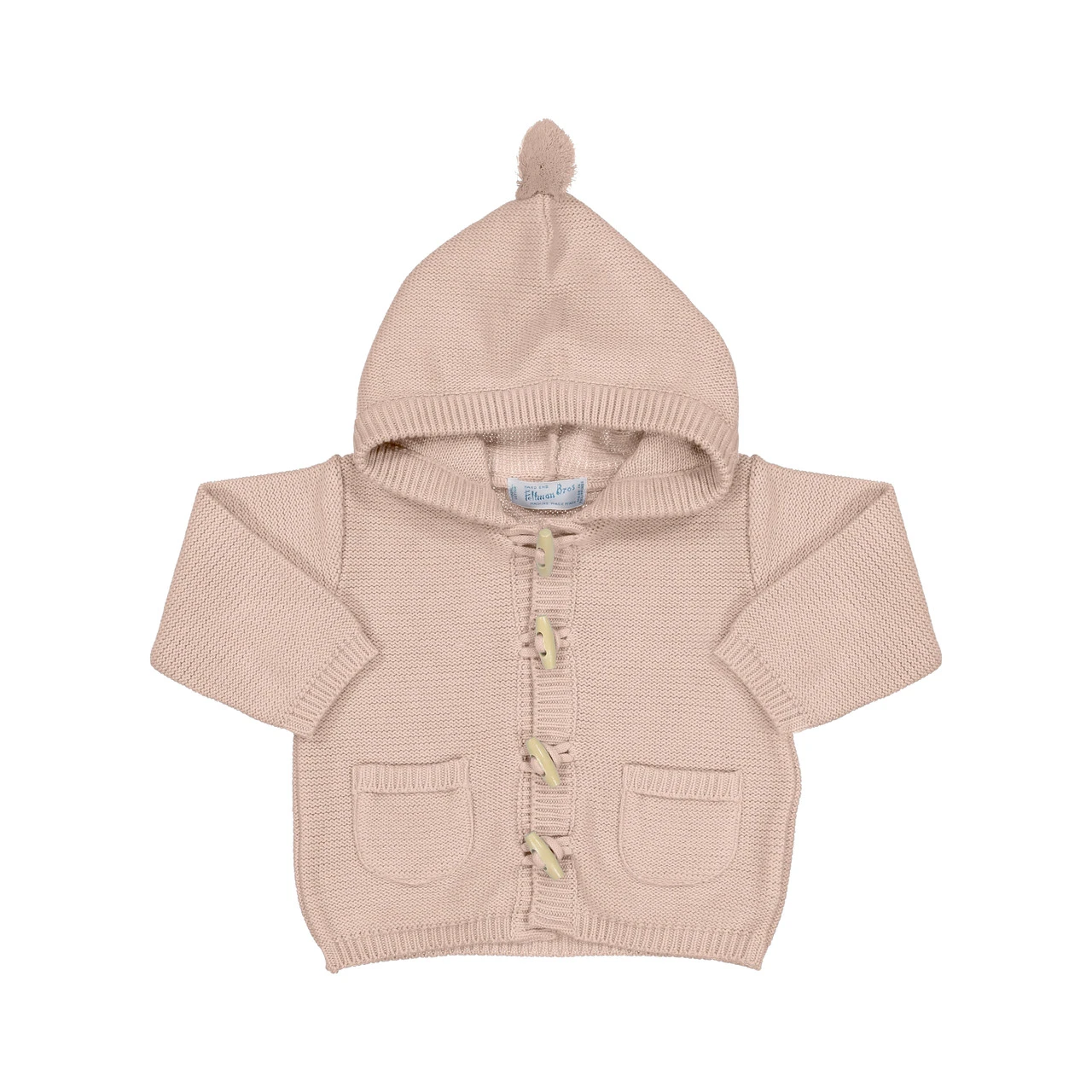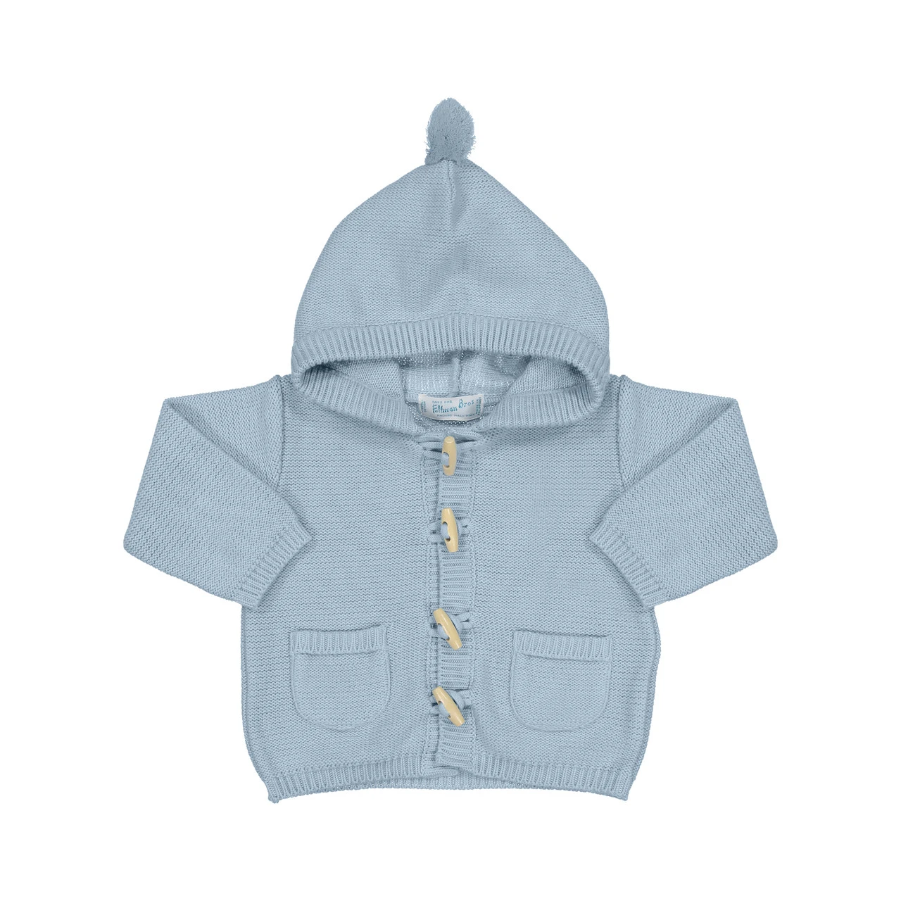 The perfect everyday knit sweater for your baby this winter! This warm knit sweater from Feltman Brothers will keep your little one safe and snug. With real wooden toggles and an adorable pompom on top, this beautiful baby sweater will be your go-to layering piece this season!
