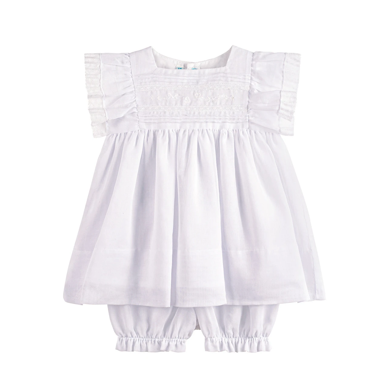 Meet the most elegant, intricate wedding dress for your little girl. This southern style wedding outfit comes in sizes 3m all the way up to 8y! (Sizes 3m-9m include matching panties.) Made of dreamy voile fabric, with the body lined and sleeves transparent for a whimsical look. With lots of lace and lots of embroidery your little one will look just like a princess!